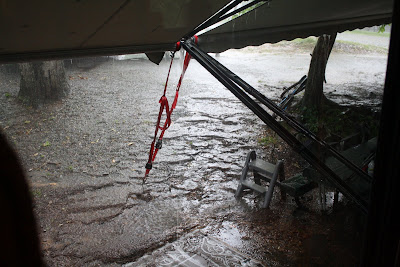 We are at Forest Lakes RV Resort in Advance, North Carolina. We traveled in overcast skies and a few sprinkles. We got here and set up, put the awnings out and secured and bam a thunder storm hits. We can't catch a break. Thunder and then rain and rain and rain. You can see it pouring off the awning.